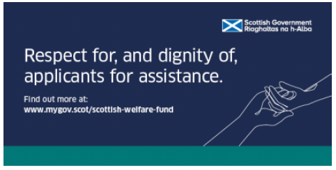A infographic which reads: "Respect for, and dignity of, applicants for assistance" and a line that says 'Find out more at: www.mygov.scot/scottish-welfare-fund'. There is also a graphic which is an outline of two hands touching each other. There is also the Scottish Government logo.