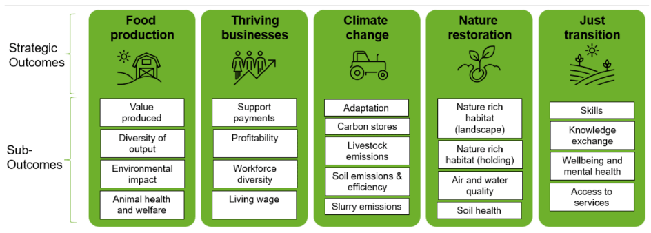The approach to developing the M&E framework for the Agricultural Reform is grounded in the requirements of the Agricultural and Rural Communities (Scotland) Act 2024. The Agricultural Reform’s strategic outcomes framework (see Figure 7.1) forms the backbone of the emerging monitoring and evaluation approach in assessing the overall effectiveness of the programme and potential learning. The proposed approach will create a suite of metrics and indicators assigned to the outcomes in order to link modelling results to outcomes which will allow them to be quantified. This will include alignment, where possible, to National Performance Framework (NPF) indicators.