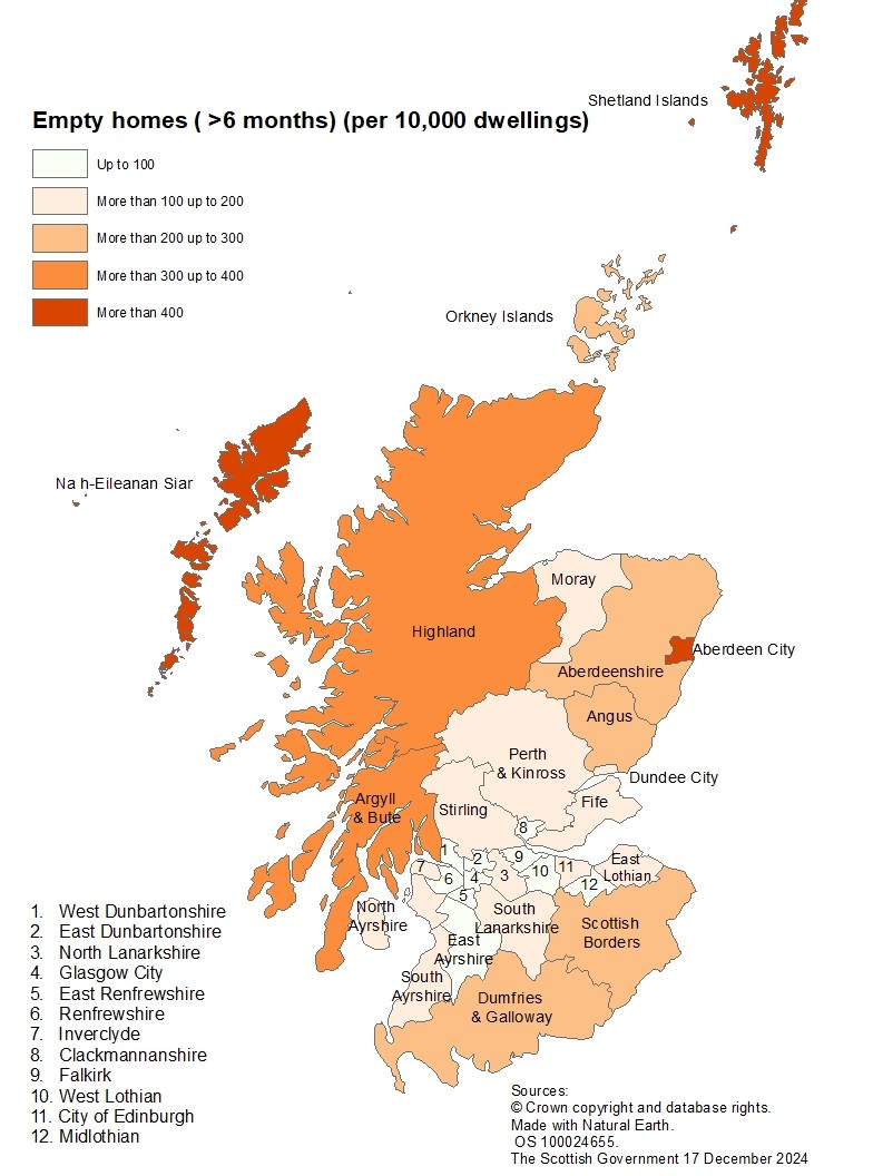Map B shows in September 2024, the highest empty homes rates were in Na h-Eileanan Siar (478), Aberdeen City (466) and Shetland Islands (409), which had rates of more than 400 empty homes per 10,000 dwellings. The lowest rates were observed in 10 local authorities which each had rates of 100 empty homes or fewer per 10,000 dwellings.