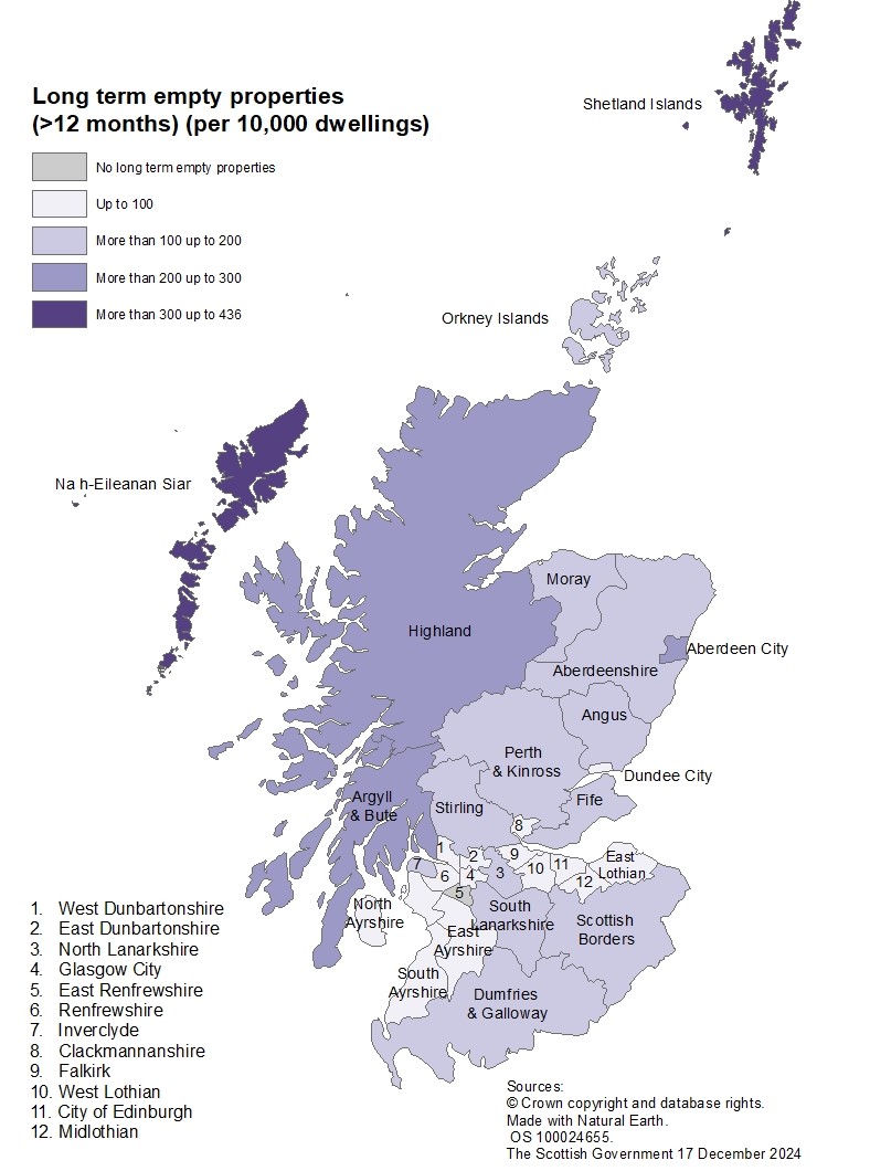 Map C shows that in September 2024, the highest long term empty property rates were in Na h-Eileanan Siar (436) and Shetland Islands (375) which had rates of more than 300 long term empty properties per 10,000 dwellings.