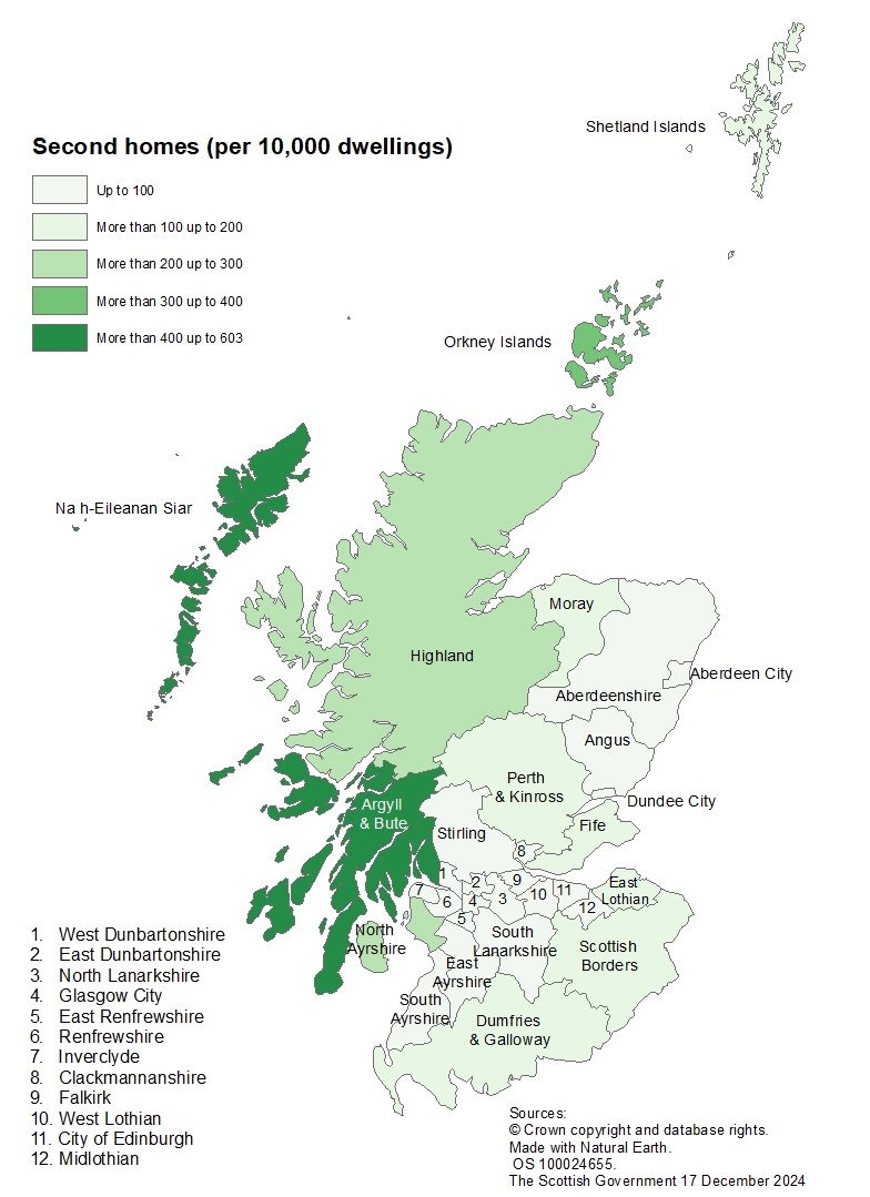 Map A shows that in September 2024, per 10,000 dwellings, the highest rate of second homes was in Argyll and Bute (603) and Na h-Eileanan Siar (598).