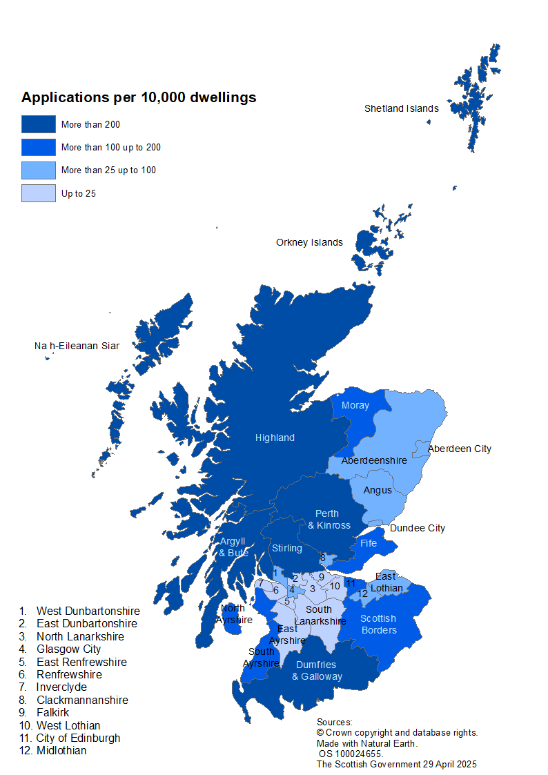Map 1 shows the rate of valid applications per 10,000 dwellings in each of the local authorities in Scotland. The very highest rates generally coincide with relatively lower population authorities which are highly attractive to tourism. Although, in general, there were high numbers in the cities, these also had relatively high numbers of dwellings.