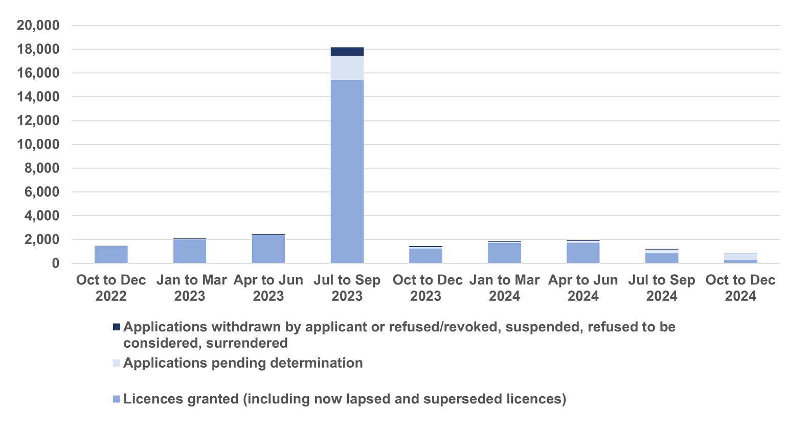 As of 31 December 2024, 86% of the validated applications were granted a licence (including those licenses which have lapsed now), and 11% of the applications were pending determination. A minority of applications were withdrawn, refused, suspended, or refusal to consider (3%).