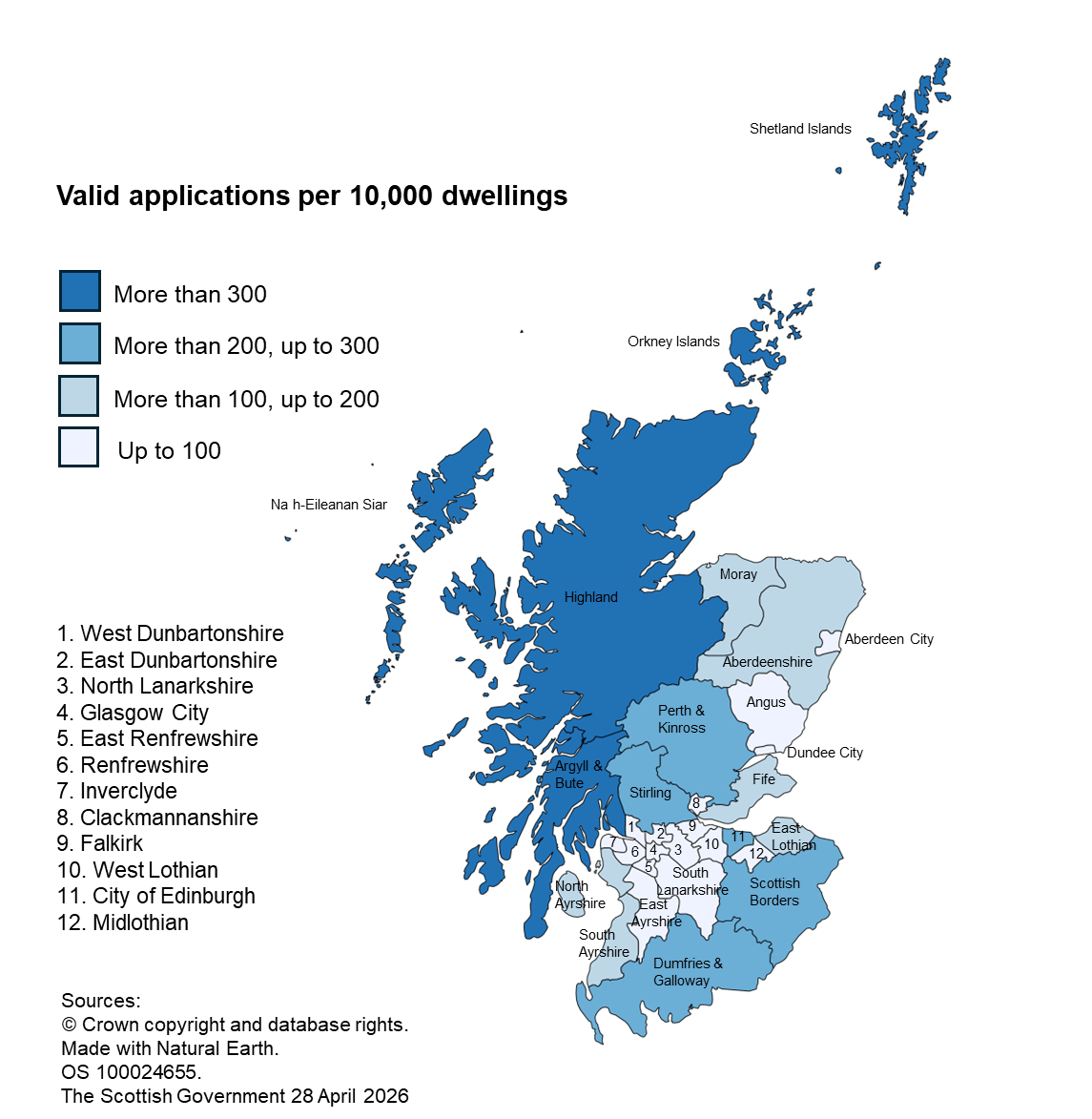 Map 1 shows the rate of valid applications per 10,000 dwellings in each of the local authorities in Scotland. The very highest rates generally coincide with relatively lower population authorities which attract tourism. Although, in general, there were high numbers in the cities, these also had relatively high numbers of dwellings.