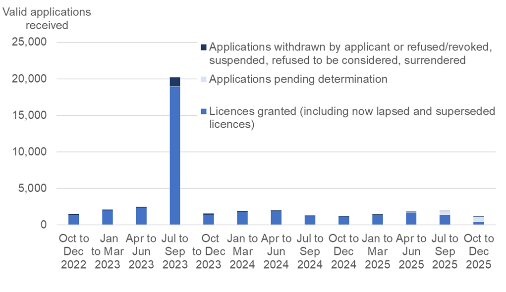 As Table 1 shows, most valid applications were granted a licence or exemption (90%) as of 31 December 2025. With 4% of applications awaiting determination as of 31 December 2025, 87% of these applications were received in the last 6 months. A further 3% of applications were withdrawn, and 2% were refused, suspended, or refusal to consider.