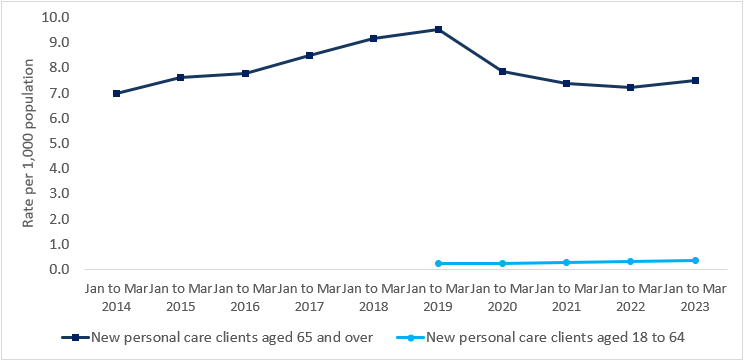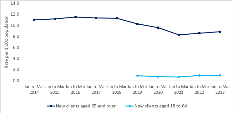 Figure 2. The rates of new personal care clients receiving a new service have declined since 2019 for older people, with a slight increase in 2023 (aged 65 and over)